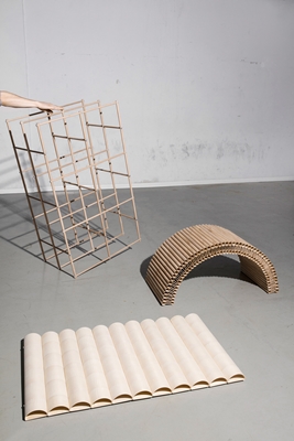Streven naar een duurzaam materiaalgebruik leidt ook tot efficiënte verwerking van natuurlijke materialen. Terwijl houtfineer gewoonlijk gebruikt wordt als dun laagje esthetische afwerking, hebben Charlotte Pommet en Elliot Kendall er lichtgewicht modules mee weten te maken. Kleine hoeveelheden fineer zijn, rekening houdend met specifieke kenmerken en structuur van houtsoorten, verlijmd om tot constructieve profielen te komen. Pao-Hui Kao heeft ontdekt hoe water, dat door papier wordt geabsorbeerd, de papiervezels herschikt en zo de structuur van het materiaal kan versterken. Van een kwetsbaar materiaal blijkt papier een constructief materiaal te kunnen worden.