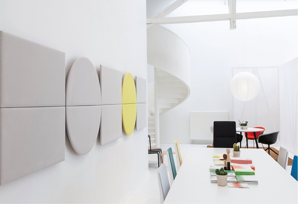 De Parentesit akoestische panelen van Arper kunnen in een frame gevat, los in de ruimte worden geplaatst. Gecombineerd in verschillende kleuren en vormen verbeteren ze niet allen de akoestiek, maar ogen ze ook decoratief. Tegen de wand geplaatst zijn ze ook te combineren met (verborgen) verlichting en geluid.