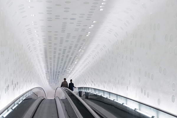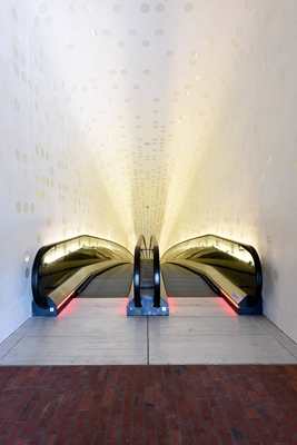 De route met de 82 meter lange, concaaf lopende roltrap naar de plaza is wel een bijzondere ervaring. Halverwege de tocht verdwijnt zowel de in- als uitgang uit het zicht en wordt de tunnel een ruimte op zich. De langzaam voorbij trekkende stippen op de wanden en het plafond doen onderwijl denken aan het draaiende mechaniek van een speeldoos.