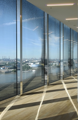 Eindpunt van de roltrap is een groot venster dat een frontaal uitzicht biedt op de Elbe, met de stad en haven als achtergrond. Via nog een roltrap bereikt de bezoeker uiteindelijk de plaza, bovenop het dak van de oudbouw. Hier is het contrast tussen bestaand en nieuw het sterkst voelbaar; een vlakke vloer van baksteen tegenover een sculpturaal ontworpen betonnen plafond.