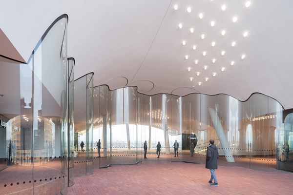 Op de plaza zijn naast de genoemde winkel onder andere een tweede entree voor het hotel en een café gevestigd. Aan weerszijden van de (overigens onverwarmde) publieke ruimte opent het plafond zich als een gewelf naar de stad en ontstaat een omkaderd uitzicht. Wie de omgeving van de Elbphilharmonie in haar geheel wil zien, moet naar buiten, de omgang op.