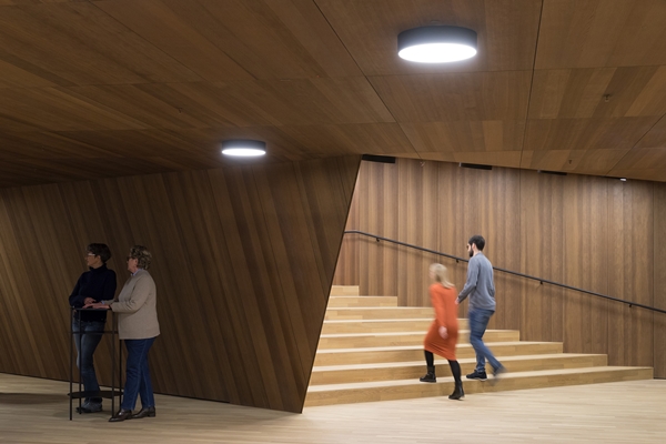 Vanuit de plaza leiden spiraalvormige trappen naar de concertzalen in de nieuwbouw. Zowel de zalen als de bijbehorende foyers hebben een eigen karakter. Er zijn twee overeenkomsten; een lichte eiken vloer die overal is doorgetrokken en de glazen foyerwanden die interessante, omkaderde perspectieven naar buiten bieden. Het wachten wordt zo zeker veraangenaamd.