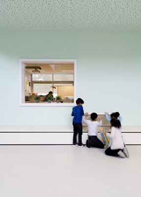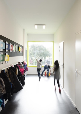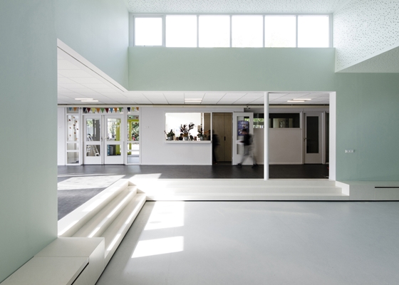 Daarmee heeft de school een open uitstraling naar buiten gekregen. Grote limoengroene raamkozijnen markeren de gangeinden aan zowel de binnen- als buitenzijde. Ze vormen onderdeel van een volledig nieuw kleurenpalet.