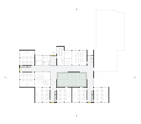 Het architectenbureau heeft de grootste patio overdekt en ingericht als multifunctionele aula. In het dak zijn verticale ramen aangebracht. De positionering daarvan zorgt dat het daglicht vanaf verschillende zijden binnenvalt, zonder dat er hinder van direct zonlicht ontstaat.