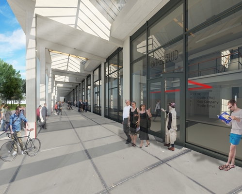 Vroeger was de plint van het Eiffelgebouw verbonden met de omliggende sanitair-ovens. Voor het nieuwe gebruik wordt de plint voorzien van hoge aluminium en glazen puien, wat de transparantie van het complex moet versterken. Op de begane grond komt een publieke doorgang, die de verbinding vormt tussen de oude binnenstad en de nieuwe wijk.