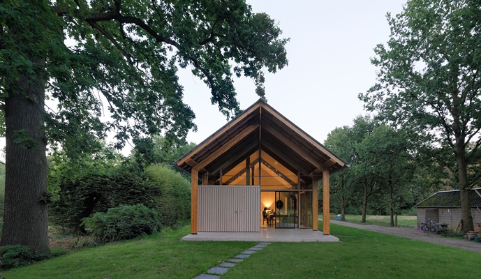 De architectuur heeft DP6 licht en terughoudend gehouden. Het hout van de gevel en de spanten refereert aan een schuur, legt het architectenbureau uit. In contrast hiermee is veel glas toegepast.
