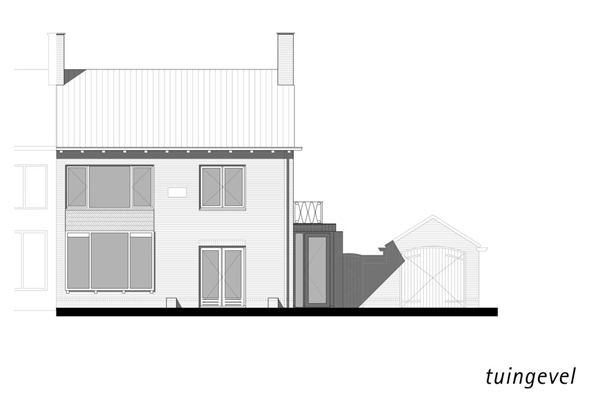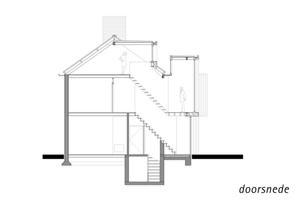 De beide architectenbureaus hebben op die manier bovendien nog een deel van de oude achtergevel en kap zichtbaar gehouden. Grote ramen bieden vanuit de ruimtes in dit deel van de uitbreiding optimaal zicht op de tuin. Doordat deze vensters niet in één gevelvlak liggen, maar juist ten opzichte van elkaar verspringen, zijn de aparte kamers als zodanig herkenbaar.