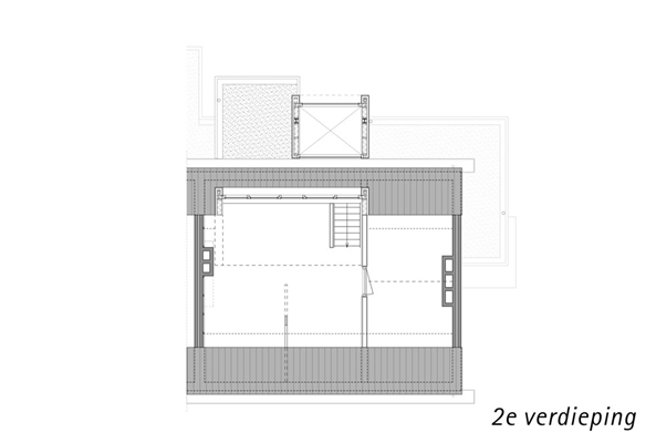 Aan de achterzijde zijn tevens een keuken, slaapkamer en studeerkamer toegevoegd. Deze drie woonprogramma’s zijn boven elkaar gesitueerd en door een nieuw trappenhuis met elkaar verbonden. De clustering resulteert in één verticale uitbreiding aan de achterzijde.