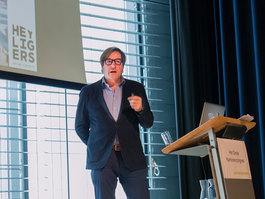 In zijn keynote zoomde architect Hans Goverde (Kraaijvanger) in op het ontwerp van stadskantoor Venlo. De ambitie van de gemeente om er een toonbeeld van circulair bouwen van te maken, heeft een kantoorgebouw vol innovaties opgeleverd. Door niet naar de aanschafprijs van het gebouw te kijken, maar vanuit total cost of ownership te rekenen, kon driedubbel glas toegepast worden en kon 1000 m2 aan zonnepanelen geïnstalleerd worden – waarvan een deel als onderdeel van de zonwering. Om toekomstig hergebruik van materialen te stimuleren, zijn overal door het gebouw toelichtingen te vinden welke materialen toegepast zijn. Goverde is misschien nog wel het meest trots op de groene gevel richting de drukke weg die langs het gebouw loopt. Deze wand haalt 30% van het stikstof en CO2 uit de lucht, zo claimde de architect.