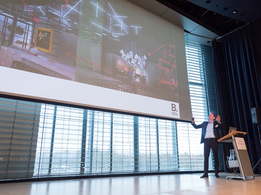 Met B. Amsterdam is een ecosysteem opgebouwd, vatte ontwikkelaar en investeerder Bas van Veggel (Timeless Investments) het halverwege zijn lezing samen. Nadat plannen om het zeer diepe voormalige IBM-kantoor met vides en nieuwe gevels te vernieuwen waren stukgelopen op de financiering, kwam Van Veggel met zijn team op het idee om niet te beginnen met het gebouw maar met het programma. Zonder veel aan het gebouw te doen, begonnen ze: met een mix van bedrijven, een groot café/restaurant, veel ruimte voor events en ontmoeting, onderwijs en begeleiding van start-up. De architectuur en inrichting werd rauw gelaten. Dat sloeg aan.