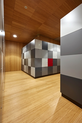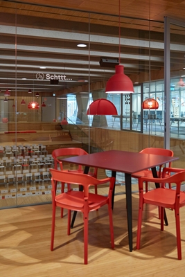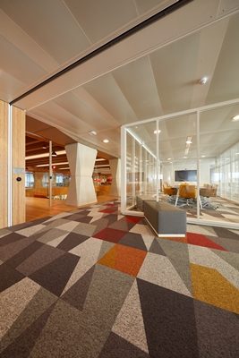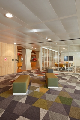 Het verloop van kleuren in het patroon zorgt voor verschillende sferen. In het Forum, het warme hart van het gebouw, komt veel rood voor. Een idee van het ontwerpbureau moet nog gerealiseerd worden: meubilair dat aan katrollen in het Forum is opgehangen.