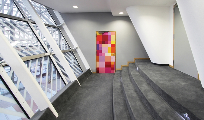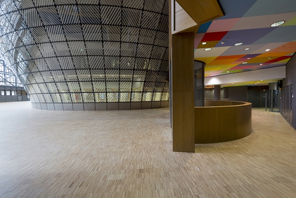 In de nieuwe gevels zijn duizenden gerecyclede houten kozijnen uit alle 28 EU-landen verwerkt. Met de kozijnen, afkomstig uit gerenoveerde woningen, wil de Europese Unie een signaal tegen verspilling afgeven en de diversiteit binnen de EU weerspiegelen. Voor de gebruikers wilden de architecten een interieur creëren dat vrolijkheid uitstraalt, zo laat Samyn weten.