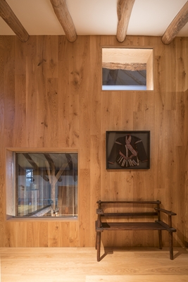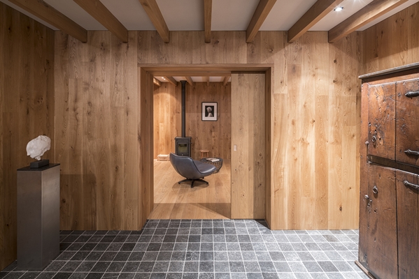 In de oude stolp zijn de overige slaapkamers, een werkkamer en alle serviceruimtes ondergebracht. De kamers in dit gedeelte beschikken over een meer introvert, eikenhouten interieur. De oude, grotendeels verrotte planken aan de oostgevel zijn vervangen door een zwart ‘patchwork’’ van verschillende soorten verduurzaamd hout.