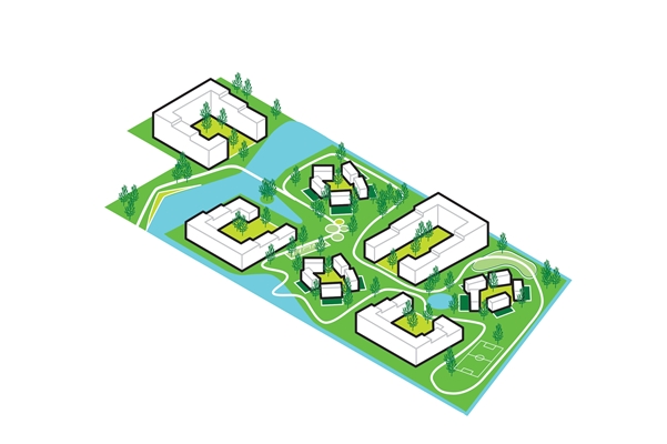 Het stedenbouwkundige plan van Marco Broekman, LINT landscape architecture en Workshop Architecten gaat uit van vier collectieve woongebouwen en kleinschalige clusters van grondgebonden woningen. Voor de eerste fase is een woongebouw van 100 woningen ontworpen, dat met zijn getrapte vorm afdaalt in het park.