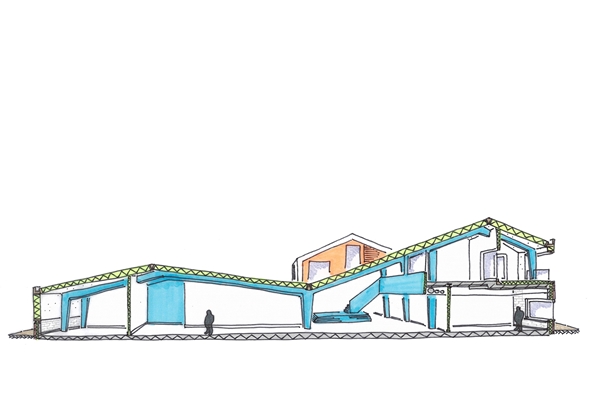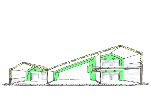 In de hoofdopzet wordt uitgegaan van een terugkerende ‘bouwsteen’ van vijftig vierkante meter, die per gebruiker op verschillende manieren is geschakeld. Dankzij deze modulaire schakeling kunnen eventuele groei en krimp in de toekomst worden opgevangen. Om zoveel mogelijk ruimtelijkheid en variatie te creëren, zijn verschillende hellingshoeken toegepast in de schuine daken.