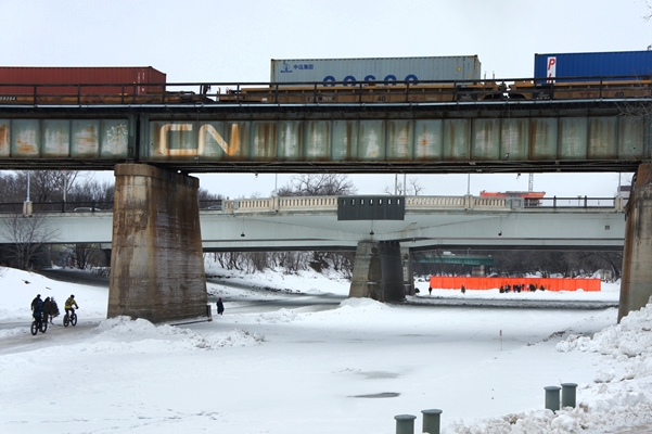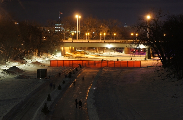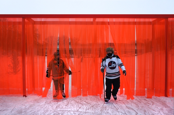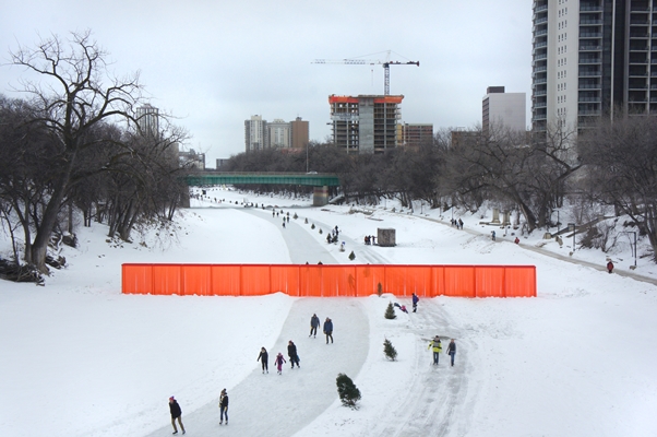 heeft op een natuurlijke schaatsbaan in een rivier bij Winnipeg een vier meter hoge doorwaadbare barrière gebouwd. Schaatsers kunnen ook vertoeven in het opvallende rode bouwwerk.