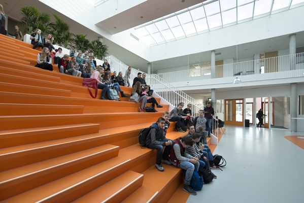 De entrees zijn gepositioneerd in de oksels van het gebouw en geven direct toegang tot de aula in het centrale gebied. Het hart van het gebouw heeft een eigen kleurstelling en dient als multifunctionele ontmoetingsruimte voor alle gebruikers. De brede trap in de aula verbindt de verdiepingen met elkaar en is ook te gebruiken als tribunetrap bij schoolevenementen.