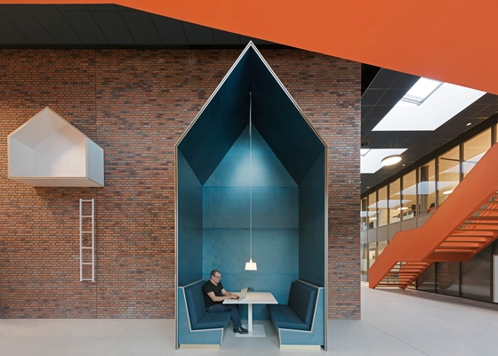 Een terugkerend element in het interieurontwerp is ook de geabstraheerde vorm van een huis. Meubels in de vorm van ‘huisjes’ bieden in de passage ruimte aan lockers en afgezonderde werkplekken. Een enkele is puur decoratief toegepast.