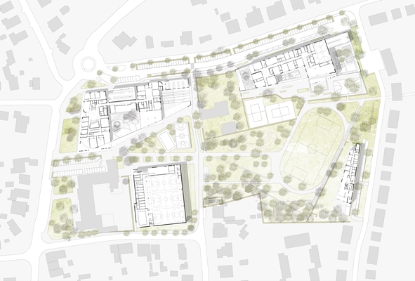 In de gebouwen zijn een middelbare school, basisschool, internaat en sportcomplex gehuisvest. Hoewel vormgegeven als een geheel, heeft ieder gebouw een eigen identiteit en karakteristiek silhouet. Via een pergola worden de gebouwen verbonden en de schoolterreinen van het openbaar toegankelijke groene hart. De pergola fungeert tevens als overdekte speelplaats.