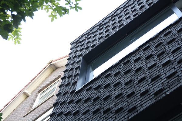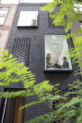 Het open interieur is door middel van een dubbelhoge glazen pui sterk gekoppeld aan de achtergelegen (verborgen collectieve) Schoonoordtuin. Aan de straatzijde is het gevelontwerp meer afgestemd op het creëren van privacy. De grote openingen, die te gebruiken zijn als zitplek, verbinden het interieur met de straat. Andere ramen zitten verborgen onder een sluier van Braziliaans metselwerk en worden ’s avonds zichtbaar als het interieur oplicht.