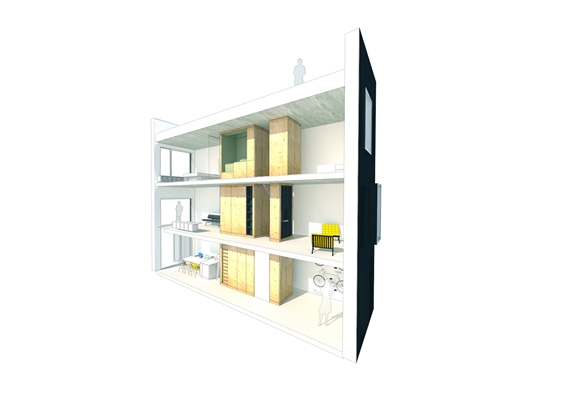 “Door een centrale kern midden in de woning te plaatsen, en hier ondersteunende functies als keuken, sanitair en bergruimte in te plaatsen, kunnen de leefgebieden zo open mogelijk blijven. De woning heeft verder geen wanden, deuren of gangen. De verkeersruimte is geen onderbreking in de woning, maar heeft altijd een dubbele functie”, aldus het stel.