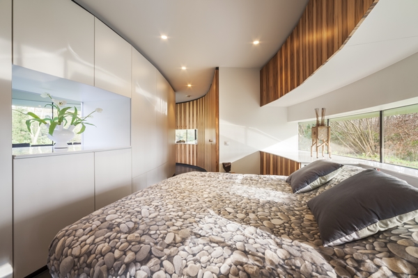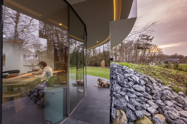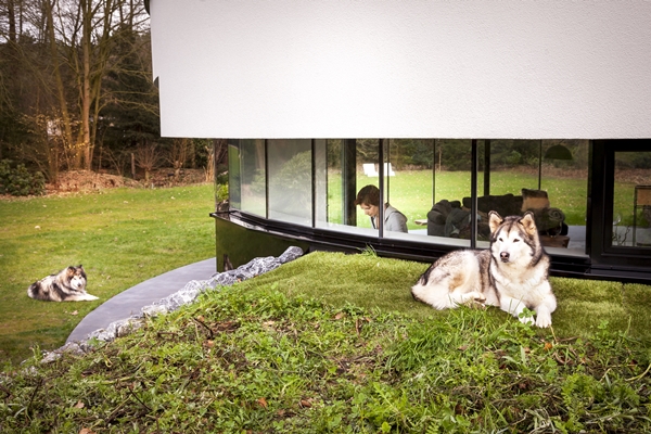heeft een villa ontworpen waarin de bewoners voortdurend met hun bijzondere poolhonden in contact kunnen zijn. Dankzij de volledig ronde gevel met een doorlopend raam heeft het echtpaar overal in de woning de mogelijkheid om visueel contact te maken met de dieren, die veel aandacht nodig hebben.