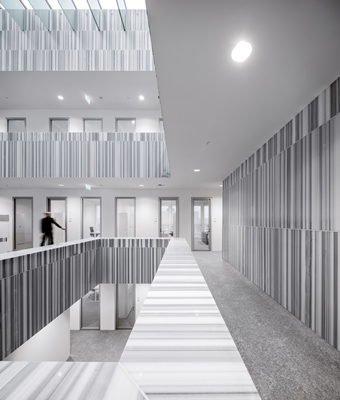 De enige plekken in het gebouw waar de norm van 500 lux niet gold, waren de atria in de bovenbouw. Voor de afwisseling in het lichtniveau heeft KAAN Architecten er in die atria daarom voor gekozen hier het daglicht iets te dempen. De daklichten zijn hiervoor vrij klein gehouden. In de praktijk valt de lichtopbrengst echter absoluut niet tegen, vertelde Panhuysen: het daglicht valt diep het gebouw in.