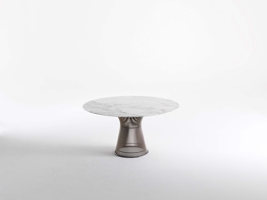 Zo zagen we klassiekers van Mies van der Rohe, Eero Saarinen en Harry Bertoia – de tafels uitgevoerd met marmeren bladen – naast een aantal nieuwe ontwerpen van Piero Lissoni. Van de laatste was bijvoorbeeld de Grasshopper, een serie minimalistische tafels met afgeronde (hier marmeren) bladen en stalen buispoten. Lissoni’s Matrioska was een kastsysteem dat bestaat uit open en gesloten vakken van diverse afmetingen, die – de naam deed het al vermoeden – in elkaar kunnen worden geplaatst.