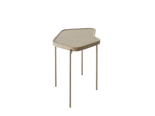 Ook gemaakt door handwerkslieden zijn de natuurstenen bladen voor het tafeltje Pond, ontworpen door Förster. Het organische gevormde blad heeft een opstaand randje en rust op een minimalistisch stalen onderstel. Een mooi gegeven is daarbij dat de verschillende soorten natuursteen afkomstig zijn van een Zweeds eilandje en feitelijk restmateriaal zijn van de vervaardiging van keukenbladen.
