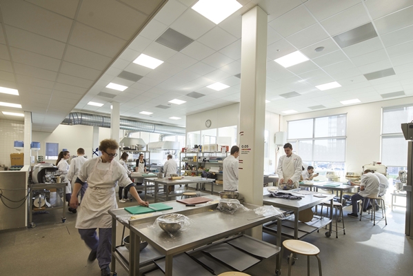 Dat resulteerde in een ontwerp waarbij de leerrichtingen via een gezamenlijk hal met elkaar verbonden zijn. Hier is ruimte voor gezamenlijk eten, studeren, chillen en ontmoeten.