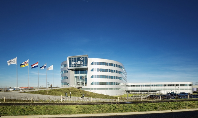 Bij Inalfa had Ibelings van Tilburg Architecten de kans om ook het landschap rond het gebouw te ontwerpen. Voor het gebouw ligt een afgedekte archeologische vindplaats die een kleine heuvel vormde. Door de hoofdentree op de eerste verdieping te leggen heeft het bureau deze beweging van het maaiveld doorgezet en een monumentale route omhoog gerealiseerd.