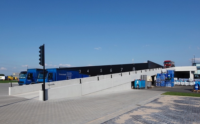 Vrachtwagens laten hun lading bij Bruestedt van een verhoogde rijbaan in de ruimte eronder vallen. Voor die rijbaan was een betonnen draagconstructie het meest economisch. In de ruimte waar de chemicaliën verwerkt worden, was hout echter weer het meest logische materiaal. Andere materialen houden het daar namelijk niet vol, vertelde Courage. En bij de verderop gelegen opslaghal was staal echter weer de beste keuze.