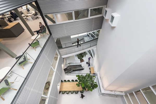 De entree op de begane grond is zo direct verbonden met het multifunctionele werkcafé (begane grond en eerste verdieping), centrale ankerpunten (tweede en derde verdieping) en het vergadercentrum (vierde verdieping).