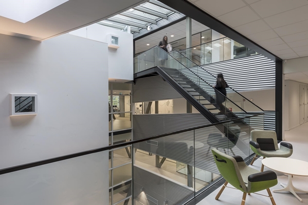Doordat natuurlijk licht een voorname plaats inneemt in het ontwerp, heeft het architectenbureau terughoudend kunnen omgaan met kleur en materiaal. Met bijvoorbeeld kleuraccenten, bijzondere materialen en grafische uitingen zijn plekken als overlegplekken en ankerpunten verbijzonderd.