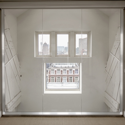 Van de kantoorverdiepingen is de zolder de ruimtelijkste. Hier zijn de spanten in het zicht gelaten en hier en daar aangeheeld, maar wordt de werkruimte via enkele toegevoegde bruggen ook over het atrium heengetrokken. Waar je op andere kantoorverdiepingen toch altijd achter de robuuste muren van het oude gebouw werkt, daar wordt de ruimte op de zolderverdieping ineens panoramisch, met een rondlopend bandraam onder het dak en verder enkel glazen binnenwanden.