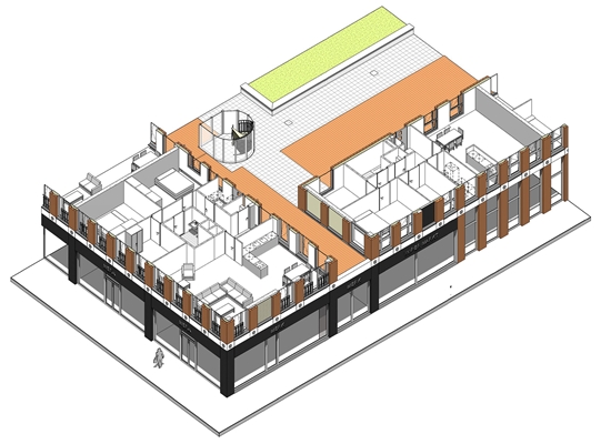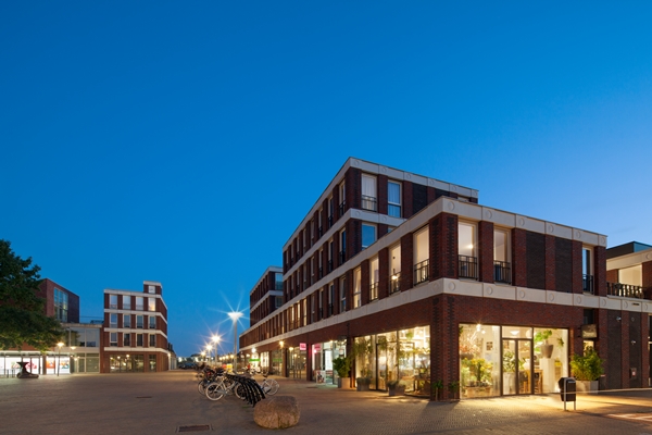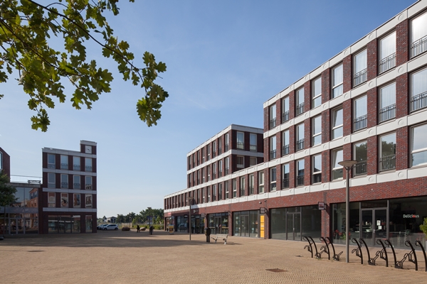 Het gebouw maakt deel uit van twee bouwblokken die plaats bieden aan een gemengd programma van winkels, horeca en appartementen. Met deze uitbreiding is een plein gecreëerd, dat aansluit op het reeds bestaande winkelcentrum. Aan het plein liggen verder een blibliotheek, een theater en een school.