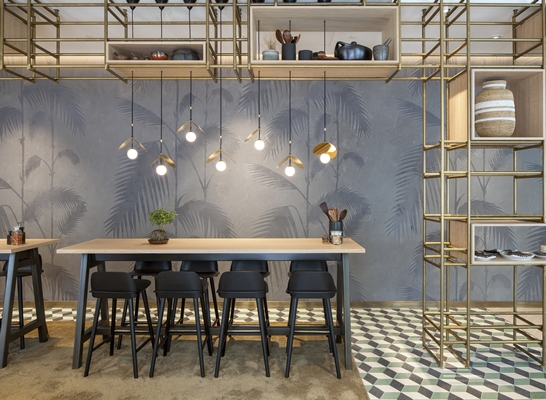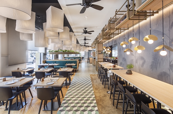 Met het palmpatroon en de plantenwand refereert concrete aan de tropen. In het toegepaste kleurpalet domineren ‘tropengroen’ en steengrijs; goudkleurige accenten moeten bijdragen aan een luxueuze en eigentijdse restaurantervaring. De houten tapis-vloer heeft een zowel natuurlijke als luxueuze uitstraling.