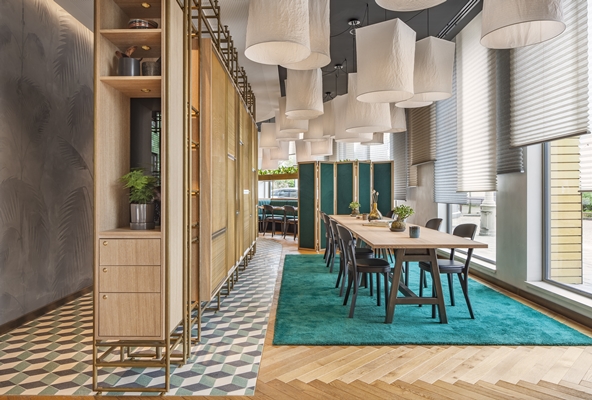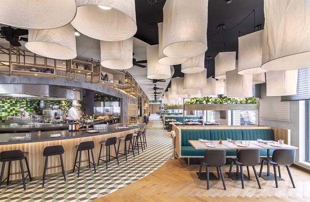 Langs de glazen façade is het restaurant voorzien van verschillende zithoeken. Het licht dat door de grote glazen gevels langs drie zijden komt, wordt gefilterd door papieren vouwgordijnen. Zo’n tweehonderd papieren lantaarns, hangend op verschillende hoogtes, creëren als het ware een tweede plafond en vergroten de intimiteit in de zithoeken.
