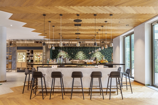 Opvallend in de lobby is ook de vloer in klassieke visgraat , deels uitgevoerd in beton, deels in hout. Het parket is doorgezet in de patio en in het bargedeelte zelfs tegen het plafond.