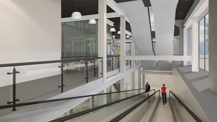 Het gebouw krijgt een nieuwe centrale ingang, waarvan de hoge rechthoekige ramen de oorspronkelijke structuur van het pand goed zichtbaar maken. Door de entree transparanter te maken, wordt deze ook uitnodigender, aldus de ontwerpers. Onderdeel van de entree is een nieuw trappenhuis, waar bezoekers naar de winkels in de kelder en op de eerste verdieping kunnen gaan.