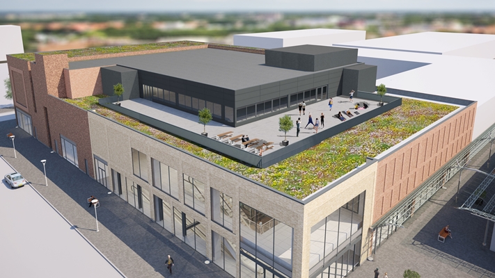 Voor het sportcentrum wordt de tweede verdieping van het gebouw uitgebreid. De etage biedt tegelijkertijd ruimte voor een terras en een groen dak. Bij de opbouw wordt gebruik gemaakt van een ander soort gevelmateriaal om een duidelijk onderscheid te maken tussen sport- en winkelfunctie. Het nieuwe dak veraangenaamt tevens het zicht voor bewoners van de omringende hogere gebouwen.