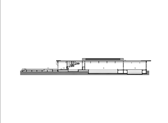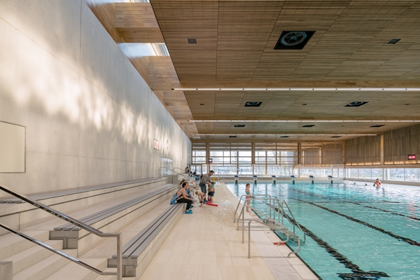 Op het niveau van de baden bevindt zich een smalle strook glas , waardoor zwemactiviteiten wel zichtbaar zijn voor wandelende voorbijgangers, maar het verkeer voor zwemmers aan het oog onttrokken wordt. Om te voorkomen dat het glas spiegeling van de zon op het wateroppervlak van de baden veroorzaakt, steekt het dak aan de oost- en westgevel verder uit.