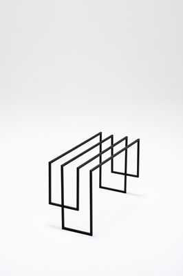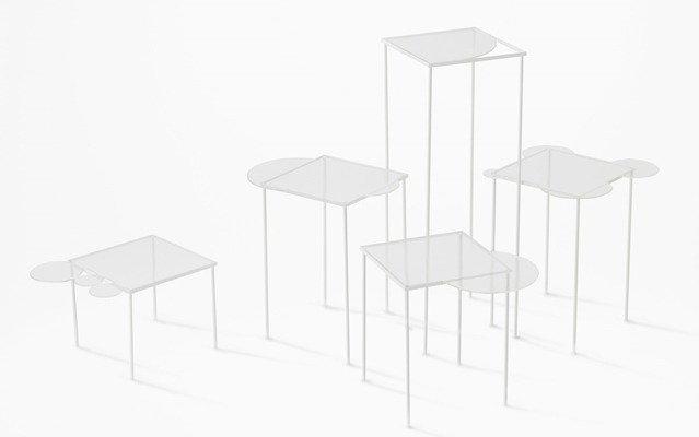 Wat is het resultaat in de praktijk? Een mooi voorbeeld van het wegsnijden uit de contour is de kruk Float (2015), waarbij twee van de vier poten niet geheel doorlopen tot aan de zitting. Het geeft de zitting een onverwachte vering. Een fascinerend voorbeeld van ‘verbinden’ vormt de Woven Table-serie, speciaal voor deze tentoonstelling gemaakt. In de metalen tafelbladen zijn sneden gemaakt, waarna er metaalstroken zijn ingeweven en vast gelast.