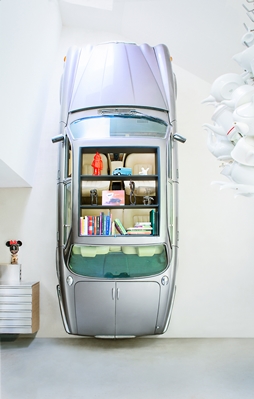 Het extreemste voorbeeld van hergebruik vormt de dertig jaar oude Daimler, die rechtop in het interieur staat. De auto moest worden geofferd, want wie een groene droom heeft, kan niet blijven rijden in een benzine slurpend vervoermiddel. De auto is omgetoverd tot “keukenkast en conversation piece”, aldus Oomen.