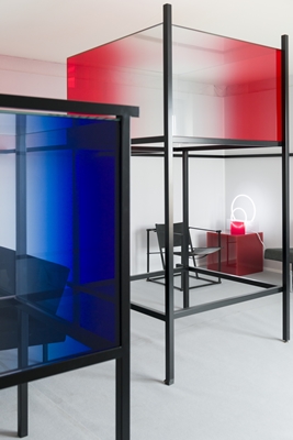 “Voor mij begint elk project met het materiaal, het productieproces en de vraag wel effect ik kan creëren. In mijn werk komt het spel van licht, transparantie, reflectie en optische effecten vaak terug. Dat is ook het geval in het ontwerp van het paviljoen. Ik heb een aantal van mijn bestaande werken gebruikt, maar aangepast in de primaire kleuren die typerend zijn voor De Stijl. Het resultaat is een echte mix van de materiaal- en optische effecten die men van mij kent en de vormtaal van De Stijl.”