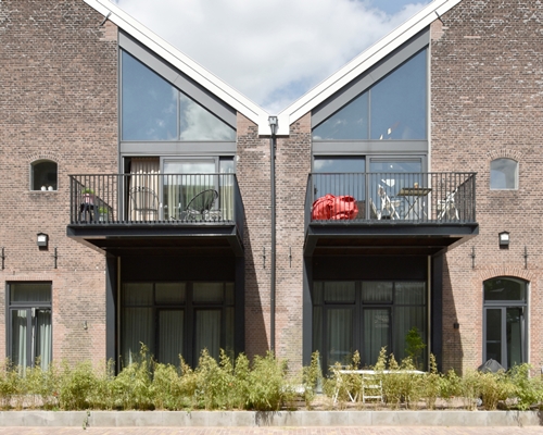 Op een braakliggend terrein, gesitueerd tussen de gesloopte hal en de doorgaande weg, heeft GAAGA een aantal rijtjeshuizen geplaatst. De nieuwbouw staat ‘achterstevoren’: aan de straatzijde kenmerkt de gevel zich door opvallende raamvlakken, verwijzend naar het industriële karakter van het complex. De voordeuren van de nieuwbouw zijn naar het binnenhofje gericht.