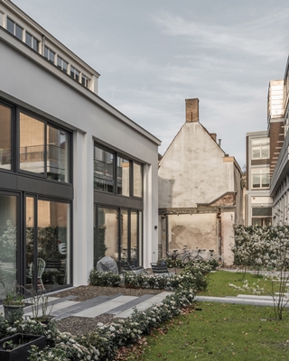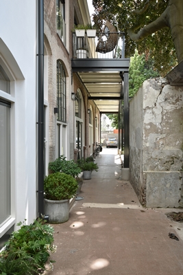 Aan de collectieve binnentuin zijn uiteenlopende buitenruimtes toegevoegd, zoals privétuinen, balkons en dakterrassen. Een doorgang in de bestaande bouw maakt het mogelijk het hofje vanaf de straat te zien. De doorgang is afgesloten met een opengewerkte stalen poort.