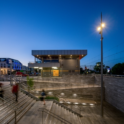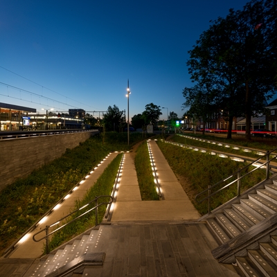 Aan de westzijde, de centrumkant, is in het verlengde van de tunnel naast de brede trap een hellingbaan gekomen. Door de materialisatie van de binnenstad door te zetten, wordt aangesloten bij het stedelijke uiterlijk van deze zijde.