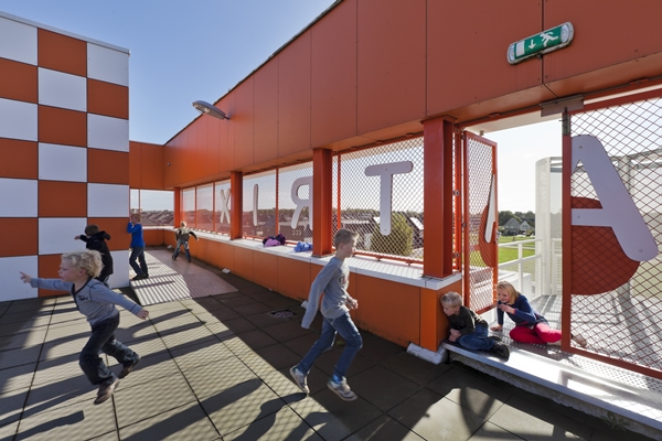 Het idee was om een nieuw type gebouw te bedenken voor een brede school: een centraal hart met vier clusters eromheen voor de afzonderlijke participanten. Waarbij het geheel toch als een eenheid oogt. Ik wilde een ‘onderwijskathedraal’ zetten in die zee van eengezinshuizen. Je mocht niet hoger dan een laag of twee á drie bouwen in de meeste Vinex-locaties. Met een sportveld op het dak (lucht) kan je er dus toch bovenuit steken en heeft het gebouw meteen een imago: sport, spel, beweging. Opmerkelijk is dat Kees Bakker aangaf dat het leerlingenaantal sterk is gegroeid.
