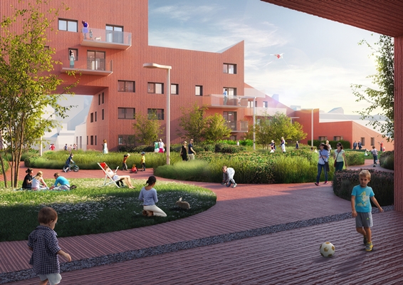 Het restaurant op de bovenste verdieping van dit gebouw heeft een volledig glazen gevel en biedt panoramische uitzichten over de historische stad en rivier. In het hart van de woonwijk komt een grote publieke binnenplaats met een tuin waar berken, elzen en hoge grassen te vinden zijn.